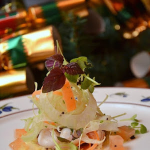 Mediterranean Octopus Salad with Tomato Gelatin, Olives Dust and Chickpea Mousse