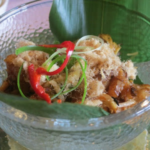 Baby French beans stir fried with crisp dried cuttlefish flakes, pickled radish and tau kua (deep fried beancurd)