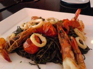 Squid Ink Spaghetti with grilled prawns,calamari