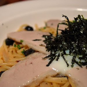 Fusion Pasta Dish Of Onsen Tamago And Cured Pork And Olives Added