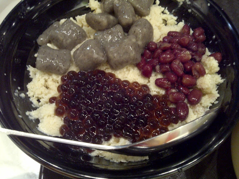 Sesame Sensation. Mini Pearl + Red Bean + Sesame Balls + Peanut Butter Base shaved ice