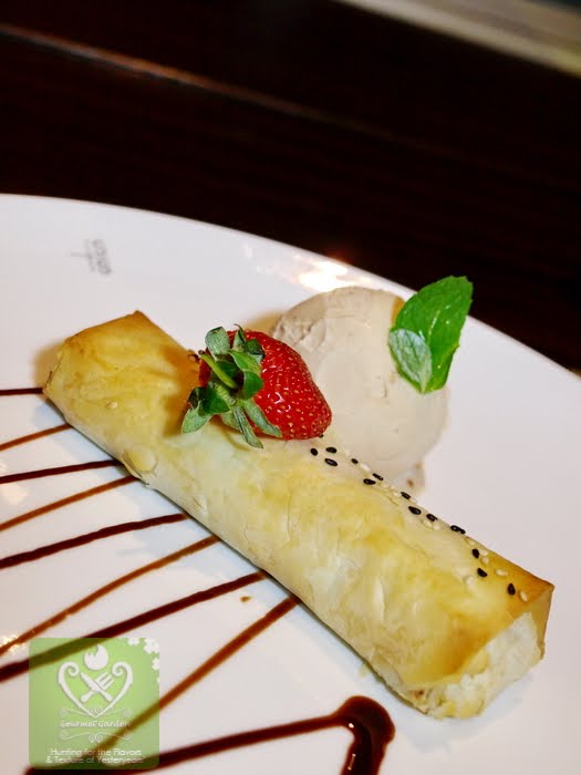 Jackfruit Strudel With Vanilla Sauce, Raspberry Macaroon & Ice Cream