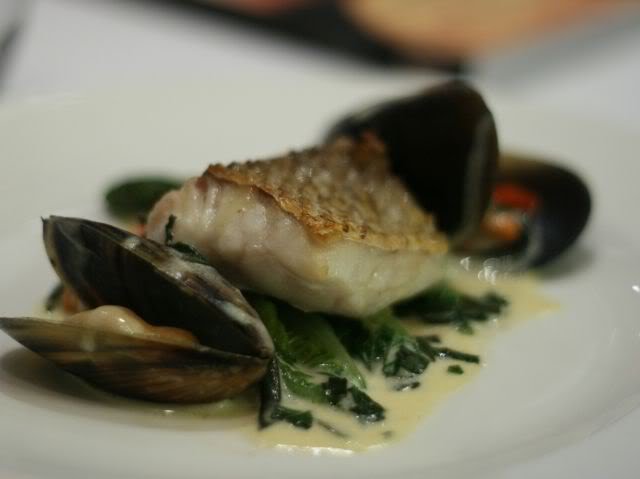 Queensland Goldband Snapper With Minute Cooked Coz Lettuce, Boston Bay Mussels, Tomato Basil Beurre Blanc