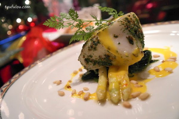 Dill And Szechuan Pepper Marinated Then Steamed Cod Medallion With White Asparagus And Sauteed Baby Spinach , Roasted Pine Nuts And Saffron Vanilla Hollandaise Sauce