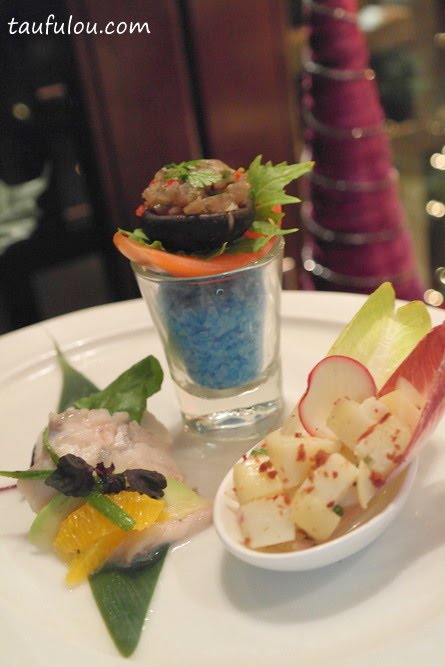 Freash sea bass with orange ,avocado and green onions: Stuffed mushroom with tuna tartar; Endive salad with potato