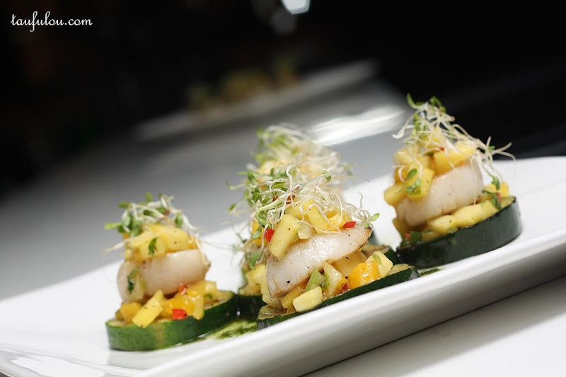 4种冷热前菜-Kerabu Mango with Crystal Dried Prawns,Crispy Coconut Prawn Roll, Baked Mussels with Cheese和Fresh Scallops with Macadamia Nuts