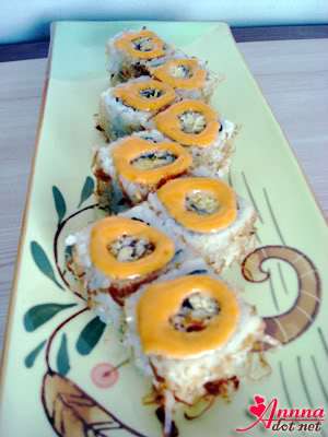 Three “flavours”; unagi, fish roe and mayo Handrolls