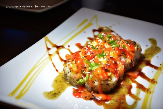 Volcano Roll: Crabmeat mix, avocado & cucumber, topped with spicy tuna, spicy salmon mango with Chef’s signature sauce