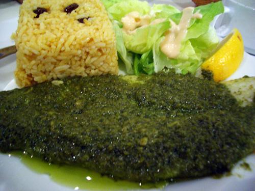 Greenish Piece of Fish is Coated with Pesto
