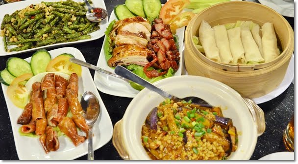 Deep Fried Pig’s Intestines, Claypot Brinjal with Minced Pork and Salted Fish, Long Beans with Minced Pork and BBQ Platter of roasted chicken and Char Siew