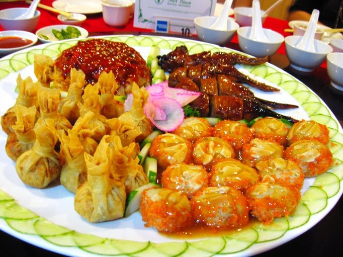 Four Seasons (四热洴盘) consisting Money Bag (金錢满袋), Jellyfish with Octopus (海蜇日本墨鱼), Stuffed BBQ Chicken Wings (烤鸡翅) and Mini Abalone Stuffed with Fish Paste (攘包贝)