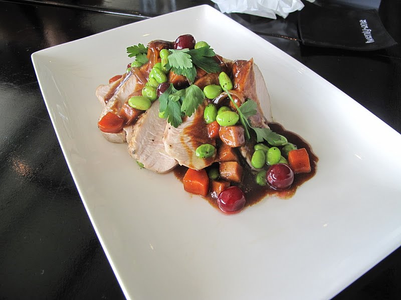 Grilled Smoke Turkey Breast with Diced Dried Fruit & Prune Sauce served with Sauteed Brussels Sprout with Turkey Bacon