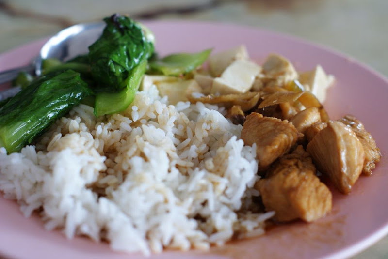 White rice with white tofu, stir fried Choy Sam, ginger chicken and topped with tasty brown gravy