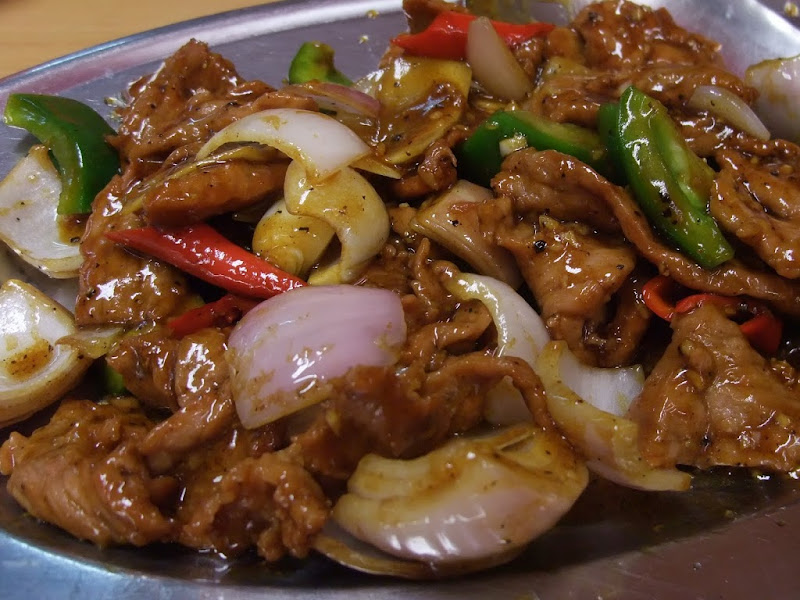 Deer meat stir fried with black pepper, onions, chili and green pepper