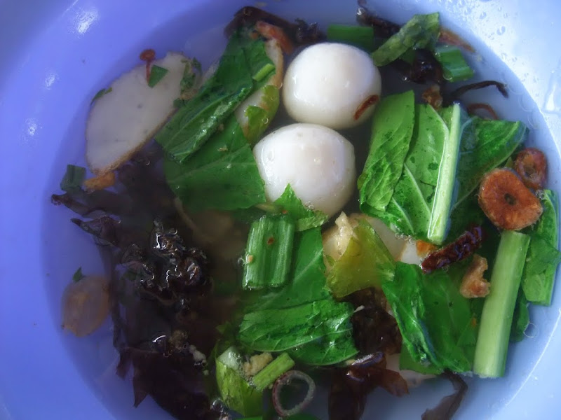 fish balls, slices of fish cakes with vegetables, preserved vegetable and seaweeds Soup
