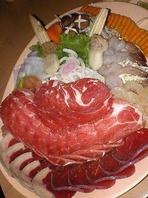 Thin slices of beef, pork and bacons