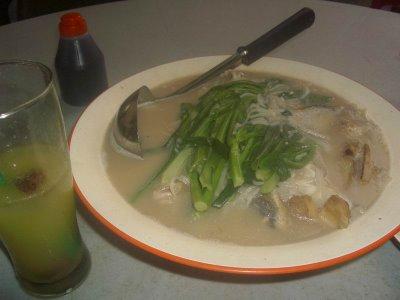 Steamed Soong Yee Thau (Bighead Carp-fresh water fish) in superior clear broth filled with Chinese long cabbage, strips of roast pork, lard, mushroom, sour plum, preserved Chinese Mustard and garnished with ginger, red chillies and cilantro