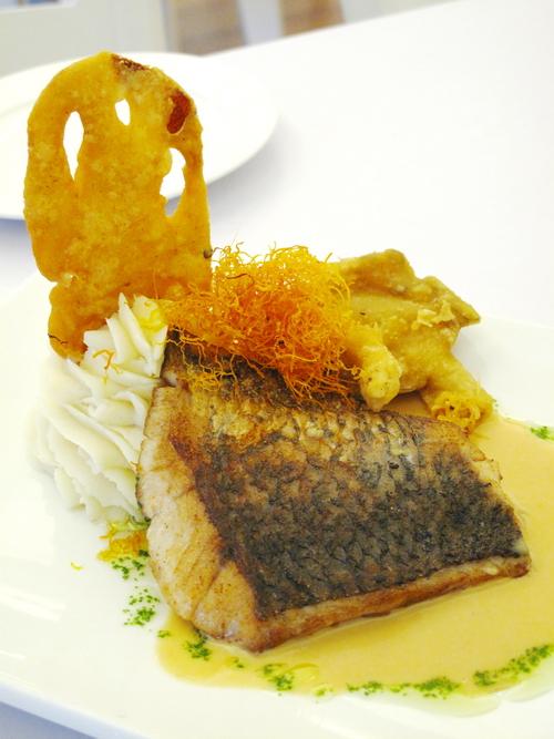 Pan seared cod medallion with eggplant and vegetables ‘caponata’ herbs saffron butter sauce