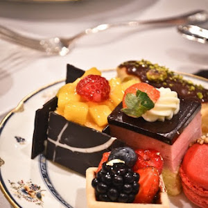 Mango Cheesecake with Choco border, Berries Tarlet with edible gold leaf, Honey Shortcake with Nuts topped with Strawberry Mousse and Chocolate Jelly, Berry Macaron and the Chocolate & Orange éclair