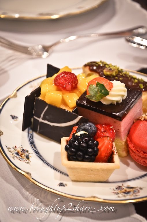 Mango Cheesecake with Choco border, Berries Tarlet with edible gold leaf, Honey Shortcake with Nuts topped with Strawberry Mousse and Chocolate Jelly, Berry Macaron and the Chocolate & Orange éclair