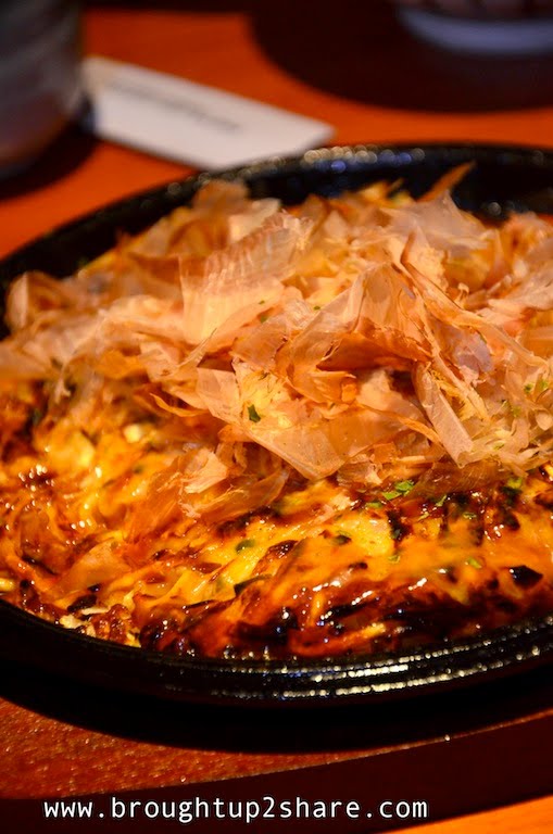 Seafood Okonomiyaki with choices of topping of Smoked Salmon, Unagi, Chicken, Seafood and Vegetarian)