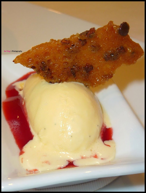 Delice of Raspberry and Gianduja Chocolate Bitter chocolate flex, raspberries, vanilla cream, chocolate sponge cake, vanilla ice cream