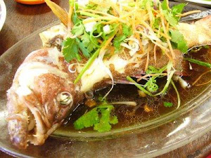 Steamed Seven Star Grouper, Salt and Pepper Mantis Prawns, Oyster Omelette, Steamed Pearl Clams with Garlic, Sweet and Sour Flower Crabs, Stir-fry Sabah 'shu-choy', Steamed Eggs